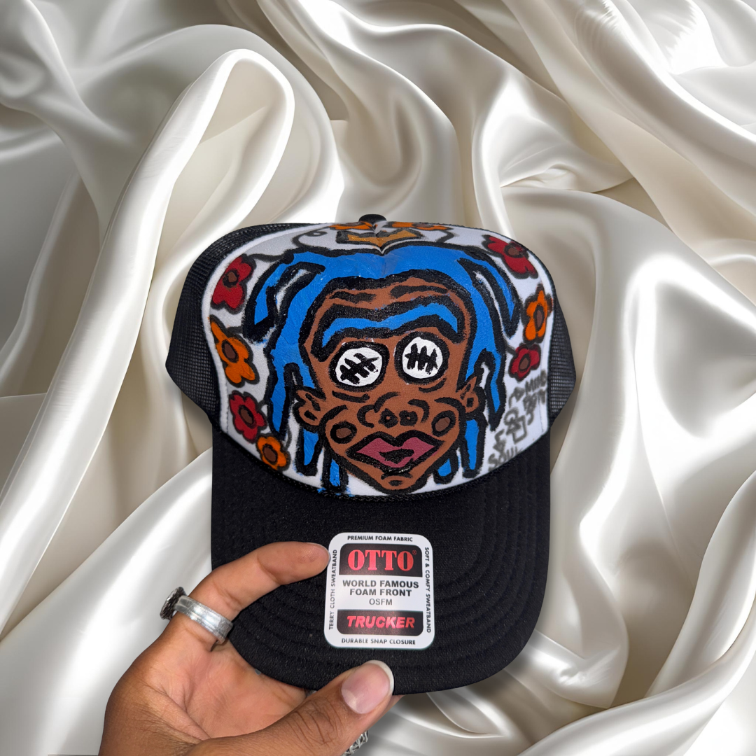 Discover a truly unique piece: a hand-painted black hat adorned with a distinct sacred face design. It features stitched cowrie-shell eyes and flowing dreadlocks crowned in vibrant flowers. Each hat is a personal reflection on heritage, beauty, and the profound wisdom woven into our hair.
