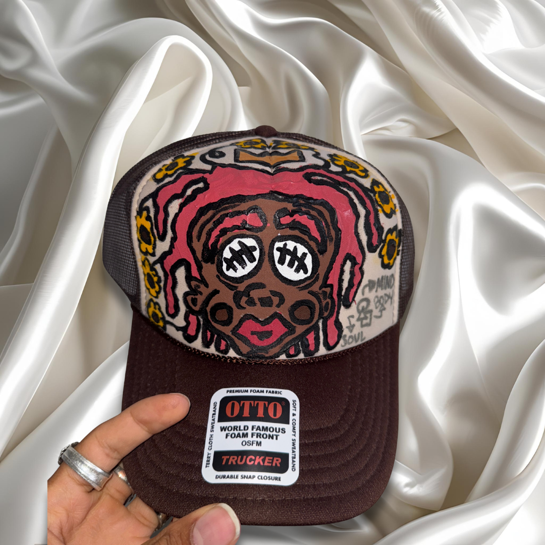 Discover a truly unique piece: a hand-painted brown hat adorned with a distinct sacred face design. It features stitched cowrie-shell eyes and flowing dreadlocks crowned in vibrant flowers. Each hat is a personal reflection on heritage, beauty, and the profound wisdom woven into our hair.