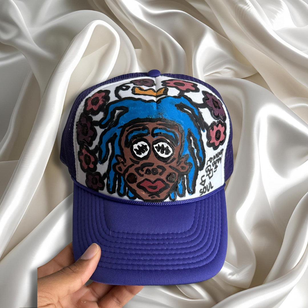 Discover a truly unique piece: a hand-painted purple hat adorned with a distinct sacred face design. It features stitched cowrie-shell eyes and flowing dreadlocks crowned in vibrant flowers. Each hat is a personal reflection on heritage, beauty, and the profound wisdom woven into our hair.